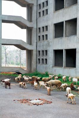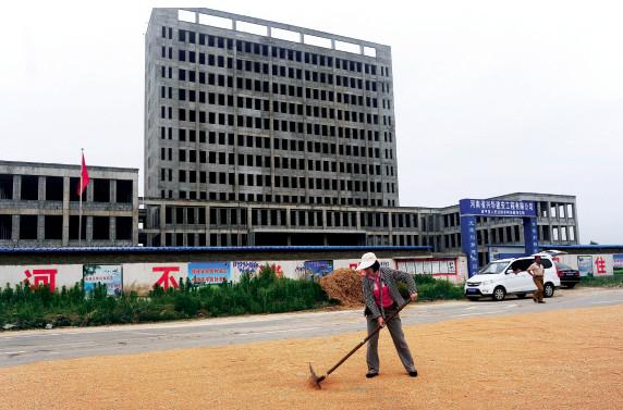 2014年7月,安徽萧县闲置“政府办公楼”前杂草丛生,当地居民在此放羊。