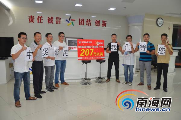 10月10日晚,海南省体彩中心工作人员仍在兑奖大厅内等待海口207万元大奖得主的出现。(记者孙令正摄)